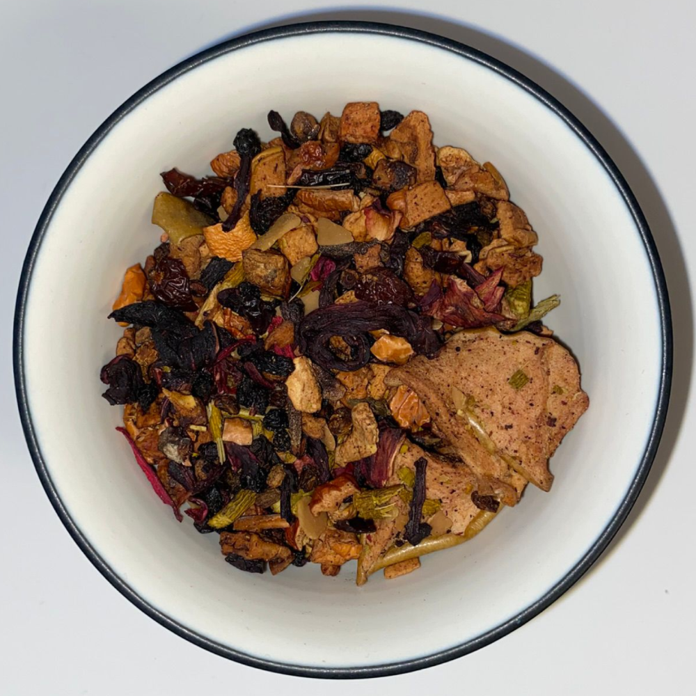 Composée de morceaux de pomme, fleurs d'hibiscus, baies de sureau, écorce de cynorhodon, viscum, bâtons de cannelle, amandes effilées, arômes et clous de girofles.