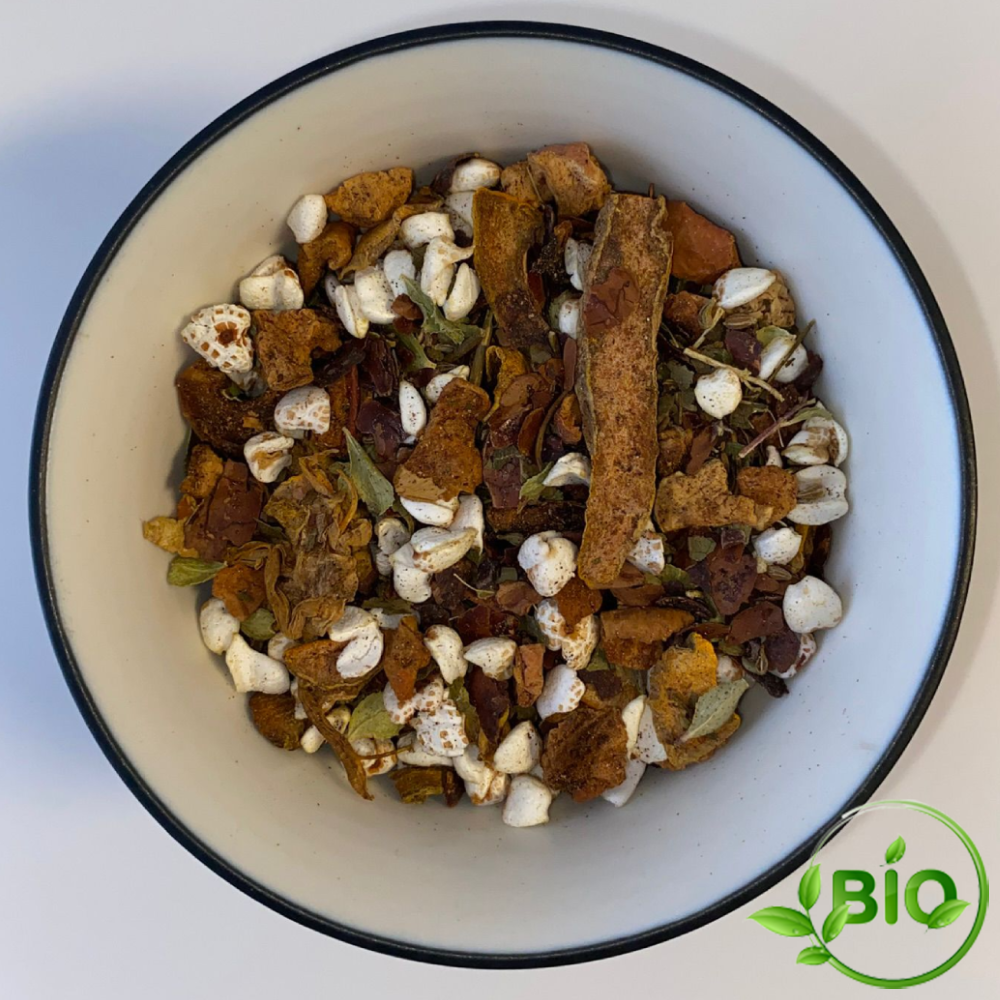 Elle se compose de curcuma, cacao, anis, sarrasin blanc soufflé, feuilles de sarrasin vertes et graines de chanvre.