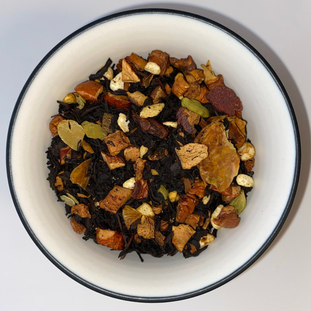Thé noir semi fermenté sublimé par la fraicheur de la mandarine, des morceaux de pommes, de la cannelle, du yaourt lyophilisé et des épices festives (badiane, cardamome, bâtons de cannelle).