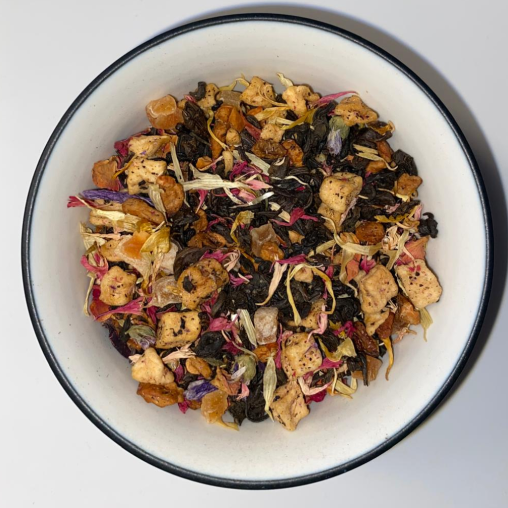 Un mélange gourmand de thé noir de Chine, de fruits tropicaux, noix de coco, vanille, mangue, framboises, roses.