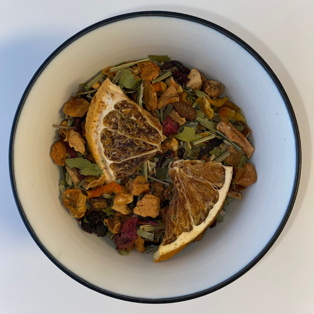 D’un coup de baguette magique cette infusion transforme votre eau en un breuvage fruité et désaltérant.Pomme, flocons de carotte, feuilles de mûre, et eucalyptus, betterave rouge, d’hibiscus, citronnelle, clémentine, d'orange.
